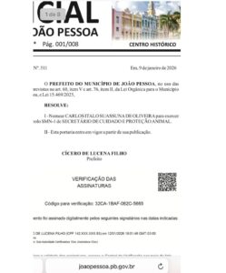 O prefeito de João Pessoa, Cícero Lucena (PP), nomeou nesta segunda-feira (9) Carlos Ítalo Suassuna de Oliveira para comandar a Secretaria Municipal de Cuidado e Proteção Animal da Capital. A nomeação foi oficializada por meio de portaria publicada no Diário Oficial do Município.
