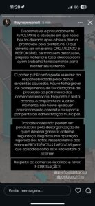 “É inadmissível e profundamente revoltante a situação em que nosso box foi deixado após bloco de rua promovido pela prefeitura. O que deveria ser um evento organizado terminou em destruição, prejuízo material e total descaso com quem trabalha honestamente para manter seu sustento”.