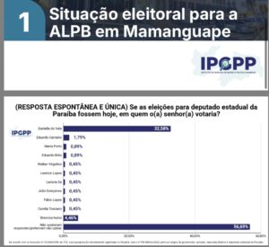 O instituto EPGPP divulgou, nesta quinta-feira (18), o resultado de uma nova pesquisa de opinião pública realizada no município de Mamanguape, no Litoral Norte paraibano. O levantamento avalia a preferência do eleitorado para os cargos de deputado estadual e deputado federal nas eleições de 2026.