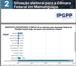 Já na disputa por uma vaga na Câmara Federal, o deputado Hugo Motta lidera as intenções de voto. Na segunda colocação, aparecem empatados o deputado Cabo Gilberto Silva e o ex-governador Ricardo Coutinho.